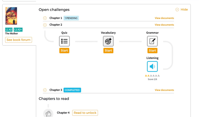 Desde esta área, podrán visualizar los libros que han leído durante el curso y, después de cada capítulo, completar actividades específicas para reforzar su comprensión y practicar el idioma.